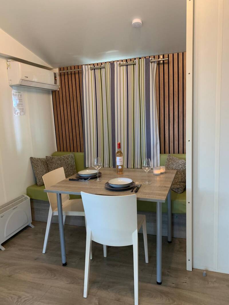 De woonkamer is voorzien van airconditioning en voor frissere dagen is er een elektrische kachel aanwezig. Er staat een eetbank met tafel en stoelen